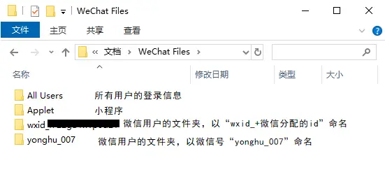 微信用户文件夹,存储着微信用户的数据,通常以登录账号的微信号命名,例如“yonghu_007”等;如果对微信号没有进行设置,就会以“wxid_+微信ID(14位数字字母)”命名,例如“wxid_abcdefg1234567”,微信ID是注册微信时系统生成的唯一id。