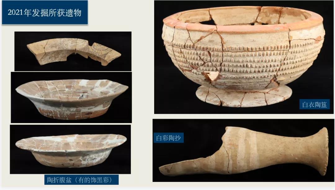 “核心区北部发现大型建筑基址、联排房屋等重要遗迹,其中大型建筑F1包括前厅、后堂,仅室内面积已达630平方米,墙壁、地面均为多层白灰面;F2出土白色堆纹陶、白衣陶、白陶、黑陶、朱砂彩绘陶,大型彩陶罐、带塞盖喇叭口平底彩陶瓶以及大量水稻遗存,显示了较高的社会发展水平。”中国人民大学教授韩建业介绍。